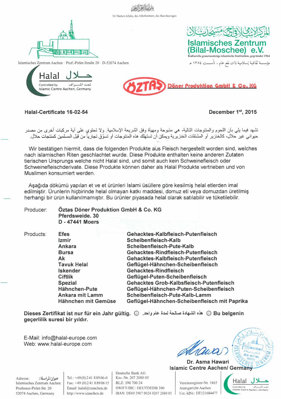 Öztas Dönerproduktion GmbH & Co.KG liefert seit 2001 jedes Jahr der DLG (Deutsche Lebensmittel Gesellschaft) Dönerspieße in verschiedenen Sorten. Diese Proben werden nach den DLG-Güte- und Produktionsbestimmungen untersucht.
