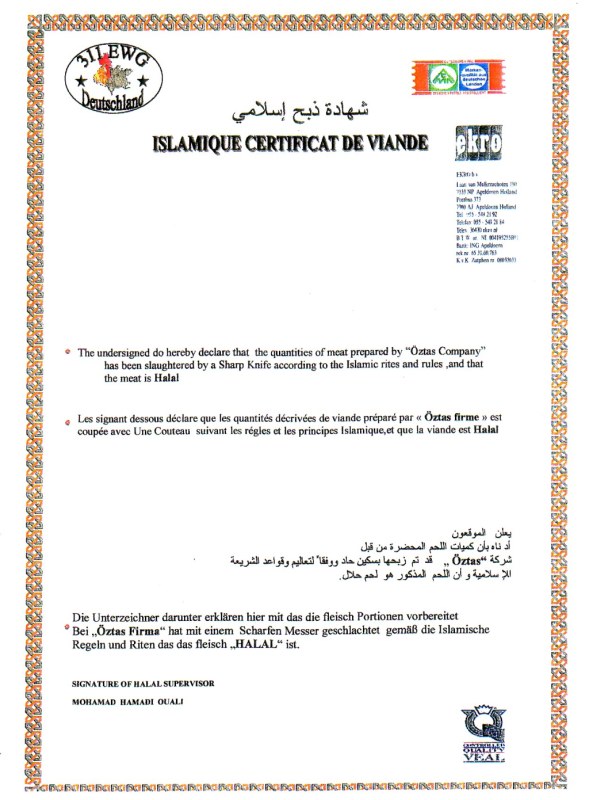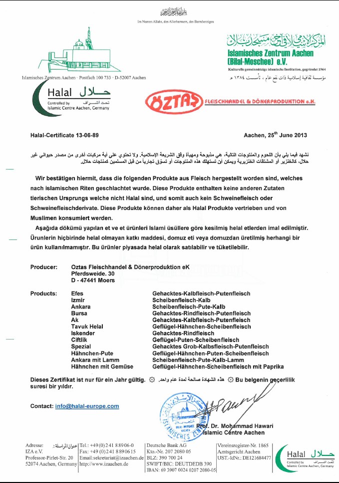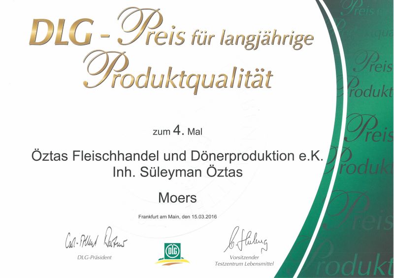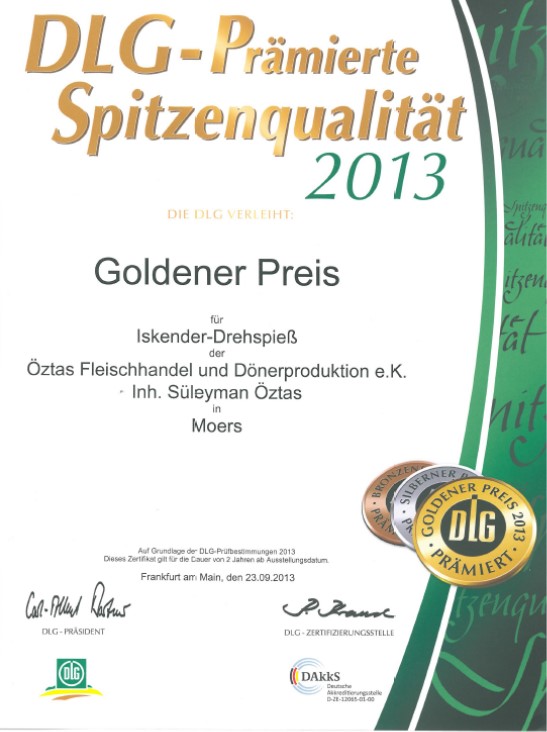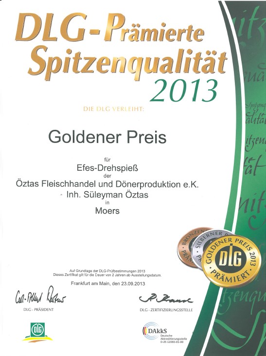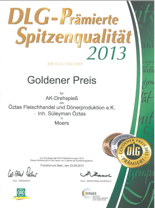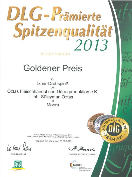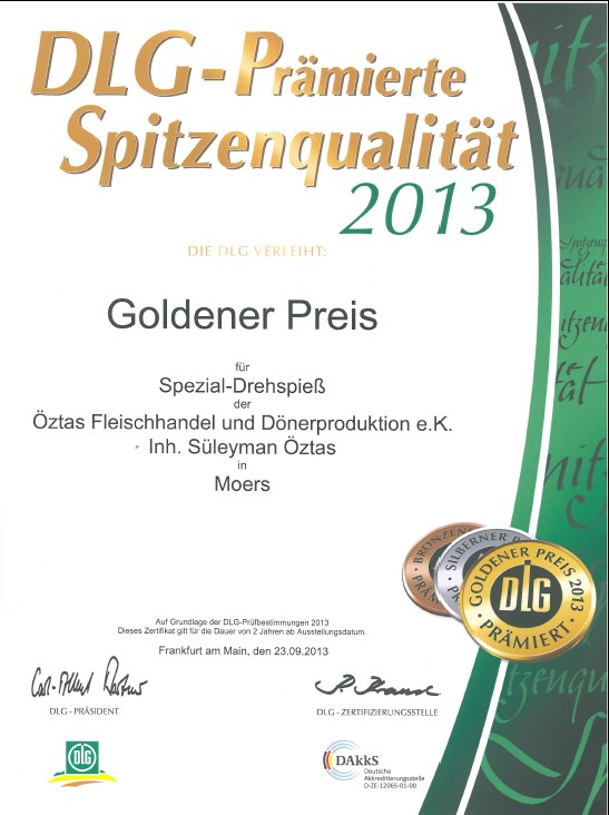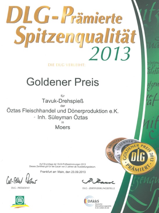 Parce que le commerce de la viande et la production de la société OZTAS kebab. e.K. atteint chaque année, le nombre maximal de points qu'ils ont reçu un certificat et la plus haute récompense, le groupe CMA-étiquette.